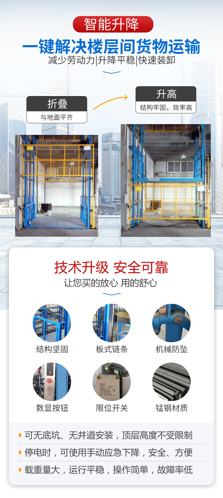 電動(dòng)液壓貨物提升機(jī)適合于有二層及以上工業(yè)廠房、倉(cāng)庫(kù)、超市等多樓層間的貨物傳輸。